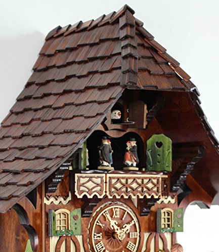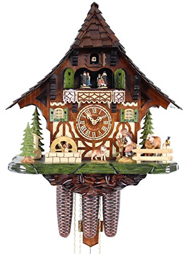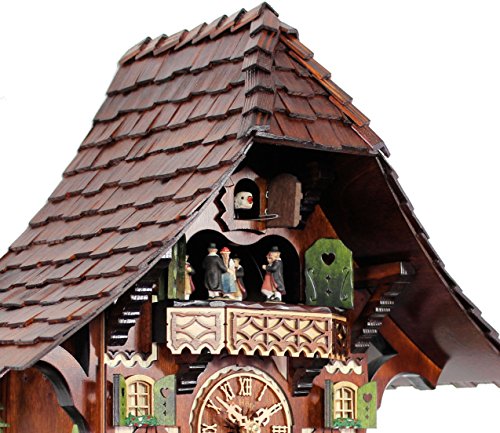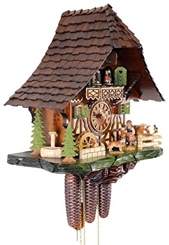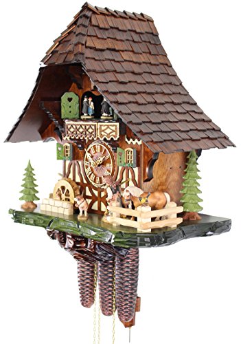 Studio : Adolf Herr Publisher : Adolf Herr Binding : Kitchen Product Description A cuckoo clock in a typical Black Forest half-timbered farm house with a shingled roof. The young girl moves the brush as she grooms the foal, while the mare stands by protectively. The movement takes place in time to the cuckoo call which is once on the half hour and on the full hour according to the time. Two alternating melodies - Edelweiss and Happy Wanderer - play every hour while the water wheel turns and the figurines wearing the Black Forest costume dance around to the music. The clock is personally signed at the back by the manufacturer Adolf Herr . His signature guarantees the experience of 6 generations of clock-workmanship. This clock comes with a certificate of authenticity (AHC). Clock Movement: 8-Day(weekly wind-up) Regula rack strike movement with night off. Clock-Face: Wooden dial, diameter 3.1 Inches (8 cm), with wooden hands. Dancing Figurines: Handcarved and handpainted wooden couples in Black Forest costume. Pendulum: Herr bolt pendulum with fine adjustment. Musical Movement: Reuge musical movment (22 tones) with two different melodies (Edelweiß The Happy Wanderer). Chime: Nickel plated Cuckoo-Bird: wooden cuckoo (handcarved). Color: walnut dark. Size: Height: 18.9 Inches (48 cm), only clock case, without weights and pendulum. Width: 15.8 Inches (40 cm) Tiefe: 9 Inches (23 cm) 0