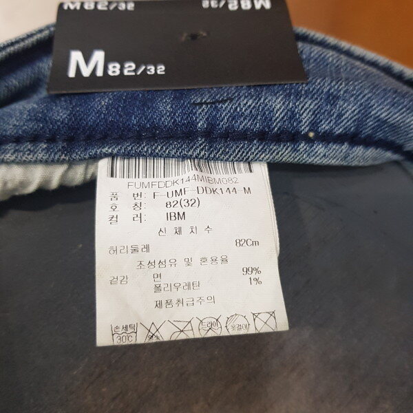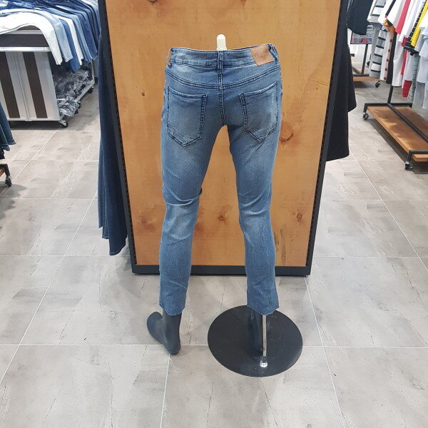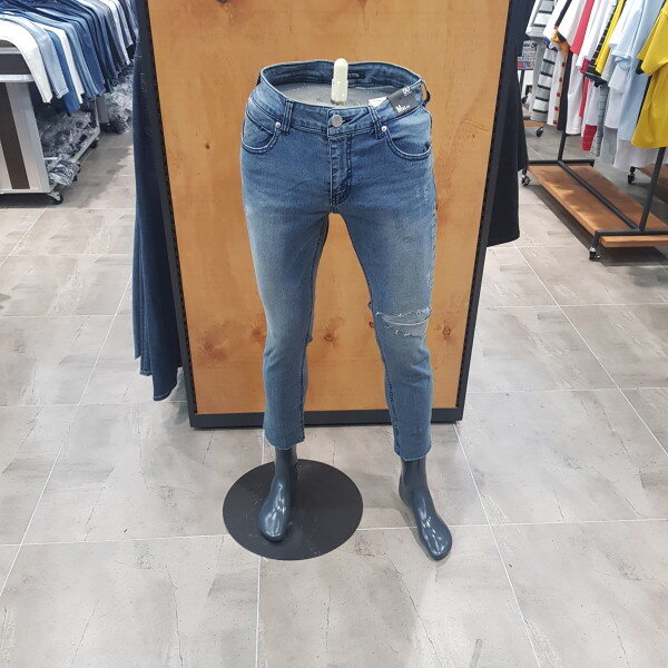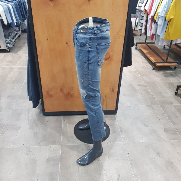 ML톤의 구제 크롭스키니. 가을부터 겨울까지 입기 좋게 구제 안쪽에 제원단 패치를 뒤짚어서 부착한 스타일리쉬한 아이템. 크롭 기장으로 밑단 컷팅형태