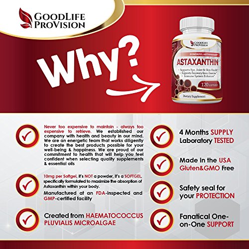 -. Feature : YOUR HEALTH IS P.R.ICELESS: Never too expensive to maintain - always too expensive to retrieve. We are proud of our commitment to providing information and education that will help you feel confident when selecting quality supplements. That's why we include the bonus guides to help you understand all Astaxanthin properties and maximize its absorption. / AN ANTI-AGING FORMULA & IMMUNE SYSTEM ENHANCER: our Natural Astaxanthin is specifically formulated to Help you release pain from ARTHRITIC JOINTS, BACK, HIPS, KNEES, and MUSCLE SPASMS, to help you Support your EYE & BRAIN health and to make your SKIN Glow. / ENERGY BOOST IS AN ADDED BONUS. It is such a pleasure to come home after a full day of work, and have the energy and enthusiasm to enjoy the evening! / NO WEIRD "OTHER INGREDIENTS" & JUNK OILS: contains ORGANIC Extra Virgin Olive Oil to help maximize absorption. Formula is untouched by chemical solvents and is FREE from preservatives, impurities, and residues. Every Bottle goes through rigorous Quality Control and is made in a GMP-quality certified facility in the USA & sourced from Hawaii. / ONE PER DAY FORMULA & 3 MONTHS SUPPLY: easy to use and swallow for active people who want to recover from heavy exercise. A nice way to get a large dose of Astaxanthin and enjoy all its benefits.
