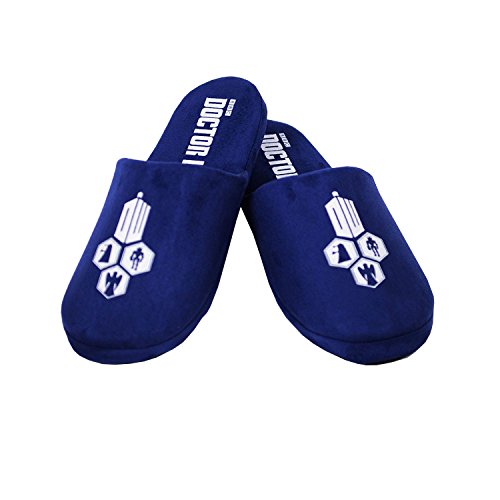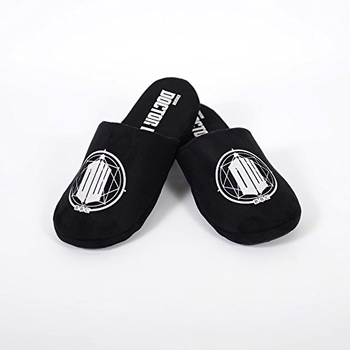 -. Binding : Apparel -. Brand : Doctor Who -. Color : Black -. Department : womens -. Feature : Officially Licensed / Featuring Doctor Who / Plush / Non-Slip Bottoms -. Label : The Robe Factory -. Manufacturer : The Robe Factory -. NumberOfItems : 1 -. ProductGroup : Shoes -. ProductTypeName : SHOES -. Publisher : The Robe Factory -. Studio : The Robe Factory -. Title : Doctor Who Tardis Adult Slippers