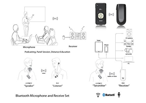 Alead LiveMICRX2 Bluetooth Microphone and Receiver Set is a new generation of Bluetooth voice transmitter and receiver solution with long range, low latency, lip sync, multiple microphone selection and clarity sound for real time education, webinar, conference, panel session, PA systems, hearing impairment, VoIP, PC audio, voice recording,