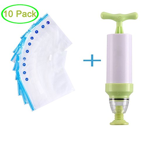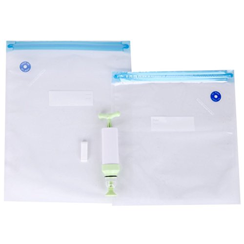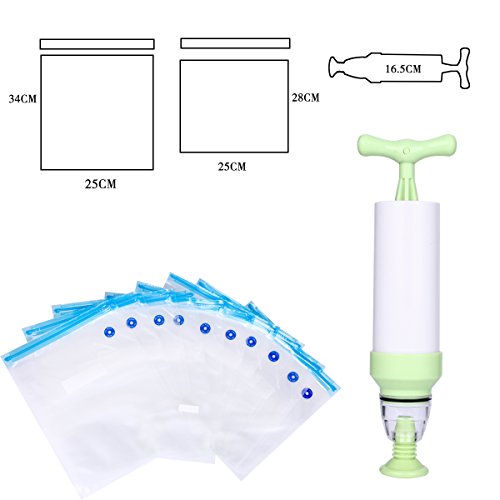 Multi-size:Package includes 2 different size (10.9x10inch/13.3x10inch) vacuum seal storage bags which are refrigerate, freeze safe that meet all your daily requirement,includes 1 hand pump, 10 vacuum bags, 1 bag sealing clip.