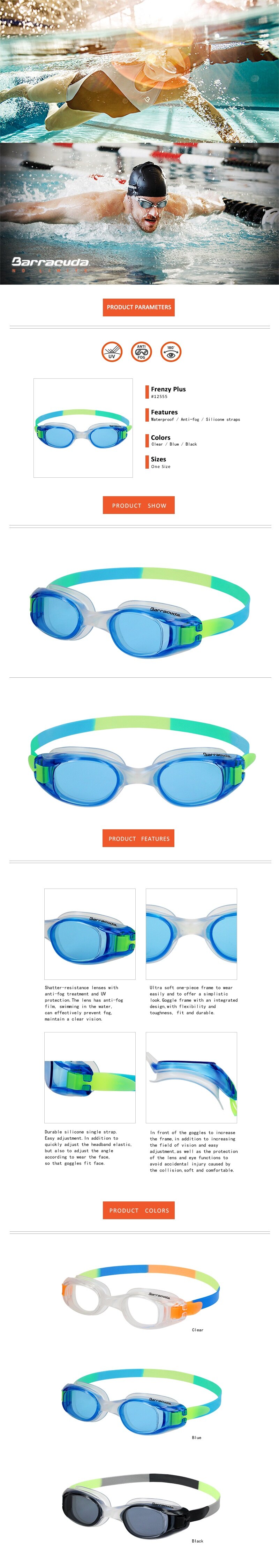 The FRENZY PLUS Goggle is designed in compact size for adults’ small faces. The one-piece soft frame provides easy and comfortable fitting. The soft nose bridge of the FRENZY PLUS Goggle contracts and expands, self-adjusting to each individual’s unique facial structure. The silicone single head strap is easy to adjust. To adjust the goggle tension, simply unhook the head strap from the T-shape open ends and pull the strap flaps. Then install the strap back to the T-shape open ends to fix the tightness.