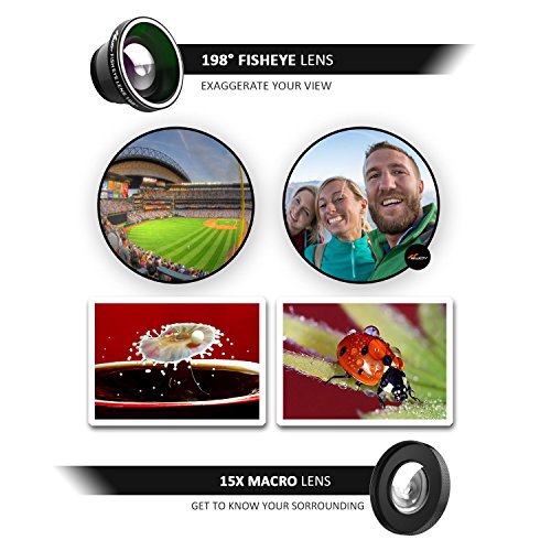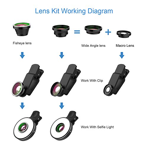 ??COMPLETE SATISFACTION AND A RISK-FREE PURCHASE We offer a?12 months?warranty for each Newdy camera phone lens kits. We wish you have a nice purchase experience! Click Buy Now and get the worthy camera phone lens kit in the Amazon. ??LED RING LIGHT AND CAMERA LENS KIT Upgraded the front or back camera of your phone or tablet. Just clip it on, switch on the LED light and start taking pictures. It is wonderful to combine with your favourite apps to post photos or videos on Snapchat, Instagram, Facebook, YouTube, etc. ??3 LIGHT LEVELS When you switch on the LED light, there are 3 brightness levels to choose: low, medium and high. 8 of bright white LEDs (colour temp 6500K) and 4 of orange/yellow LEDs (colour temp 1800K) are combined for a natural selfie light. The LED light is easy to charge. It has a USB cable and doesn't drain the battery of your phone or tablet. ??FOR EVERY PHOTOGRAPH FANS When buying Newdy camera phone light lens kit, you will receive a 3 in 1 set, specifically designed for iPhone 7/6/5. Samsung users are not left out either, from the original S1 to the S6 series, included the Edge models. For any compatibility doubts, please contact us, or post a question on the listing that you are currently on. PACKAGE INCLUDED: - 1x Fish Eye Lens (198 degrees) - 1x Wide Angle Lens (0.6x) - 1x Macro Lens (15x) - 1x LED Light - 1x USB Cable (for charging the LED Light) - 1x Protective Carrying Case - 2x Clips - 2x Lens Caps - 1x Lanyard - 1x Retail Box - 1x Hook 0 |
