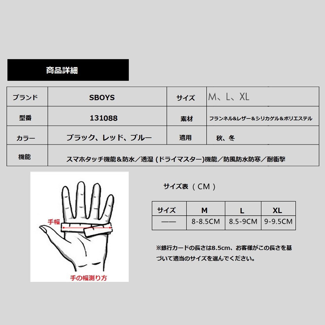 For smartphone: Adopt special material for touch panel at the tip of forefinger, you can operate smartphone or tablet PC while wearing glove!