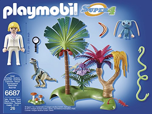 -. Binding : Toy -. Brand : PLAYMOBIL® -. Label : PLAYMOBIL -. Manufacturer : PLAYMOBIL -. Model : 6687-Parent -. ProductGroup : Toy -. ProductTypeName : TOYS_AND_GAMES -. Publisher : PLAYMOBIL -. Studio : PLAYMOBIL -. Title : PLAYMOBIL Super 4 Lost Island with Alien and Raptor Building Kit