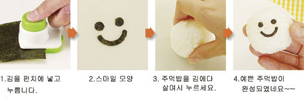 [사 용 방 법] 펀치사이에 김을 넣고 누르기만 하면 간단하게 싱글벙글 얼굴 모양을 뽑을수 있습니다. 뽑은 김을 물기없는 그릇에 놓고 주먹밥을 그 위에 놓으면완성 !■ 사이즈 :W4×D6×H4cm ■ 소재·성분:ABS 수지■ 3개 한세트 입니다.주의사항:사용후 버튼을 누르면서 흐르는 물로 싯으시면 되구요.안에 금속 칼날이 있기때문에 면봉으로 식용유을 발라서 보관하시기 바랍니다.
