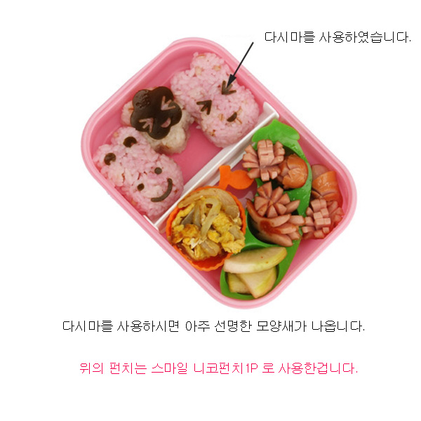싱글벙글 김 펀치3세트 입니다.보기만 해도 군침이 도는 도시락이네요 !아래의 그림과 같이 두꺼운 김을 사용하시면 아주 잘되오니 참고하시구요혹시라도 잘 안되시는 경우 편치의 불량이 아니오니 딱딱한 김으로 사용해 주세요.상품 불량률은 0.1% 입니다.
