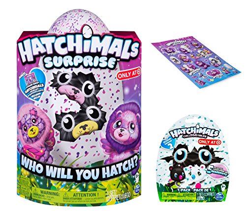 -. Binding : Toy -. Brand : Hatchimals -. Department : unisex-child -. EAN : 0677306303533 -. Edition : Hatchimals Surprise -. Feature : Includes: (1) Hatchimals Surprize Ligull Twins, Instruction Guide, Cheat Sheet, (1) Sticker Sheet and (1) BONUS CollEGGtible Blind Bag Pack (Season 2) / This / Hold and rub your Hatchimals Surprise egg and you will hear adorable sounds and may even see a set of eyes inside! Love and care for your egg to help your twins hatch! / Hatchimals Surprise are made for kids aged 5+. 2 AA batteries and 3 LR44 button cells batteries required (included). -. Genre : Pretend Play - Interactive -. IsAdultProduct : 0 -. ItemPartNumber : 20090659-20090660 -. Label : Hatchimals -. Manufacturer : Hatchimals -. MPN : 6038404 -. PackageQuantity : 1 -. PartNumber : 6038404 -. ProductGroup : Toy -. ProductTypeName : TOYS_AND_GAMES -. Publisher : Hatchimals -. Studio : Hatchimals -. Title : Hatchimals Surprise Ligull Hatching Egg w/Surprise Twin + BONUS CollEGGtible Bearakeet Blind Bag (Season 2) -. UPC : 677306303533
