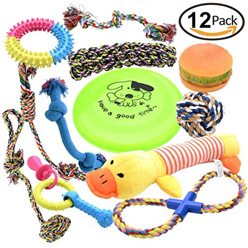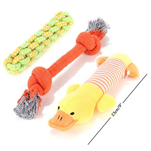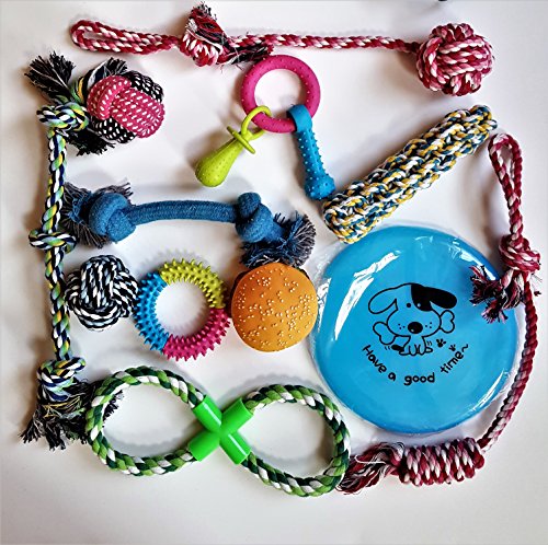 - Dog chewing ring - Chewing dumbell - Puppy pacifier - Rubber nipple - Rubber flying disc: (Random color in each set) - Squeaky toys (duck hamburger) - Cotton toys.
