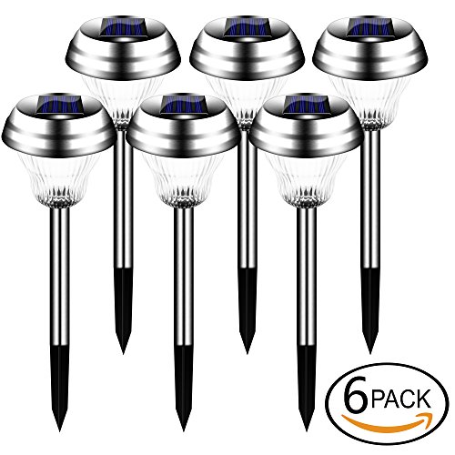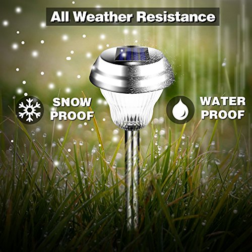 - Weather-Resistant - Finishing with durable stainless steel, never worry about exposing the solar lights to the rain or snow. The lights can work normally under all kinds of weather with the waterproof rating of IP44 and weatherproof. ABS material ground stake no corrosion in the light bottom.
