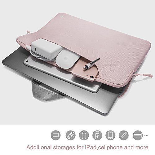 The sleeve comes with smooth handls, which enable you to carrying your laptop or other essentials at ease; you can also hand it on your arm to free your hands in comfort; The handles can also be tucked away in the pockets to make it as a sleeve, which can easily slide into your briefcase, backpack, or luggage