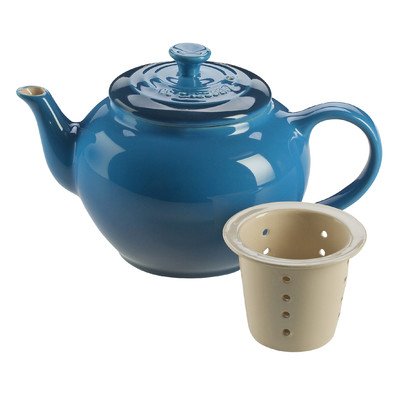 Studio : Le Creuset of America Publisher : Le Creuset of America Binding : Kitchen Product Description A lovely addition to any kitchen collection, this small stoneware teapot by Le Creuset holds up to 22 ounces-a nice size for individual servings or when enjoying a cup of tea with a friend. The unit, which measures approximately 5-8/9 by 5-8/9 by 4-8/9-Inch, comes with a handy infuser insert specifically made to rest inside for perfectly steeped loose-leaf tea. Other highlights include a large side handle, a gently curved pour spout for graceful serving, a round-shaped lid with a knob, the Le Creuset name in raised letters, and Le Creuset's signature concentric rings for an added touch of charm. 0