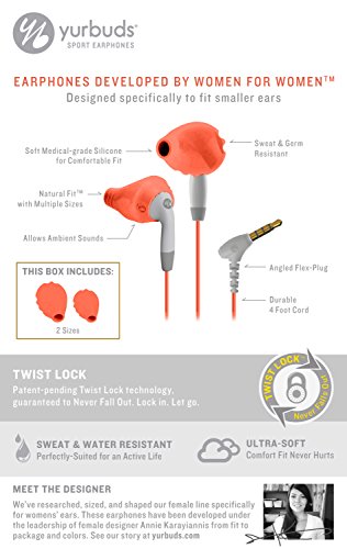TWISTLOCK TECHNOLOGY yurbuds TwistLock into place for a secure fit that never falls out, even under the most intense workout conditions. SWEAT + WATER RESISTANCE Developed for training in any conditions. AMBIENT NOISE AWARENESS Designed to allow more ambient noise than most other earphones at the same volume levels. EXCEPTIONAL SOUND QUALITY Clinically proven acoustics for deeper, richer sound. FLEXSOFT Ergonomically designed to avoid nerve rich areas of the ear. Made with flexible silicone, yurbuds are ultra soft and comfortable for hours on end. PERFORMANCE ENHANCING Deliver consistent music, which is clinically proven to inspire longer, harder workouts.