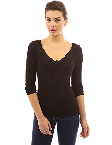 PattyBoutik Cotton Blend V Neck Crochet Lace Inset Long Sleeve Blouse. Model in pictures is 5 feet 8 inches (173cm) tall wearing size S. Empowering women to feel stylish, always.