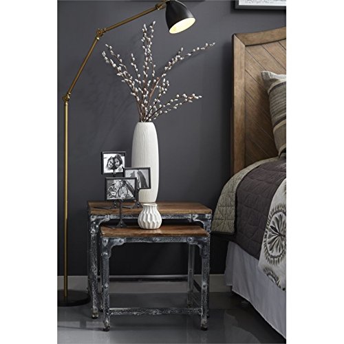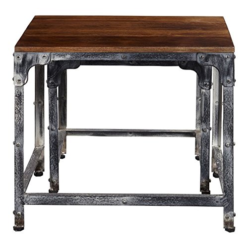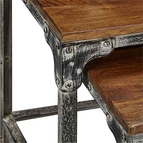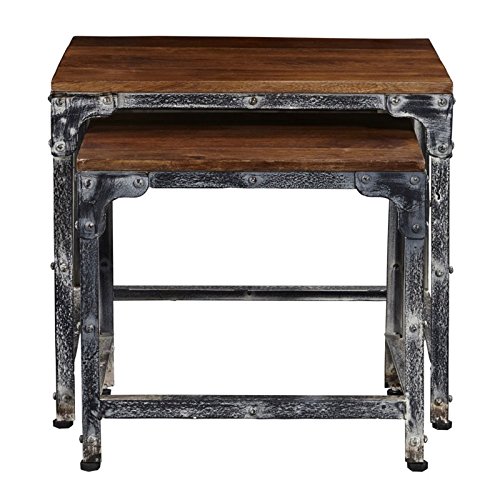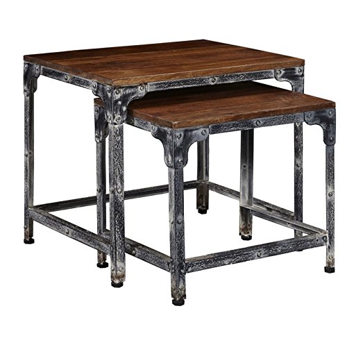-. Feature : Finish: Brown / Material: Metal / Set of two industrial style nesting tables / Antique finished metal frame with corner brackets and rivet details throughout / Solid wood tops with antiqued finish and distressing