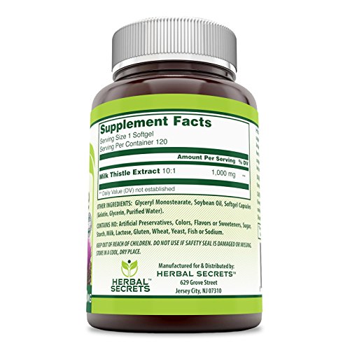 -. Binding : Health and Beauty -. Brand : Herbal Secrets -. Feature : Herbal Secrets Milk Thistle - 1,000 Mg 120 Softgels - Potent Antioxidant Properties / Standardized to 80% Silymarin. / Supports Liver Health. / Supports Healthy Hearts & Immune Function. / Milk thistle has been used for more than two millennia as an herbal medicine for liver support and a number of other purposes -. Label : Herbal Secrets -. Manufacturer : Herbal Secrets -. ProductGroup : Health and Beauty -. ProductTypeName : HEALTH_PERSONAL_CARE -. Publisher : Herbal Secrets -. Studio : Herbal Secrets -. Title : Herbal Secrets Milk Thistle - 1,000mg Milk Thistle - Standardized to Contain 80% Silymarin per capsule - Supports Healthy Liver Function and Detoxification- 120 Softgels per container