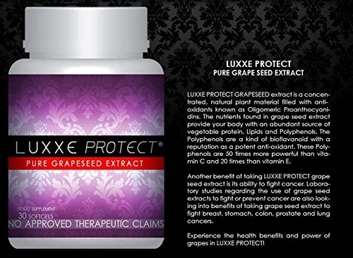 -. Binding : Health and Beauty -. Brand : FrontRow -. EAN : 0011711605590 -. Feature : FrontRow uses only the purest form of grapeseed extract for this product, and none of their products are tested on animals. / Made with Pure Grapeseed Extract, LUXXE PROTECT is an extremely powerful antioxidant that energizes the mind and body, Has Cardiovascular benefits and is a key part in healthy skin nutrition -. IsAdultProduct : 0 -. Label : FrontRow -. Manufacturer : FrontRow -. MPN : FR-LUXXEPROTECT-30 -. PackageQuantity : 30 -. PartNumber : FR-LUXXEPROTECT-30 -. ProductGroup : Health and Beauty -. ProductTypeName : HEALTH_PERSONAL_CARE -. Publisher : FrontRow -. Studio : FrontRow -. Title : NEW Authentic Luxxe Protect, Pure Grapeseed Extract - 30 Capsules -. UPC : 011711605590