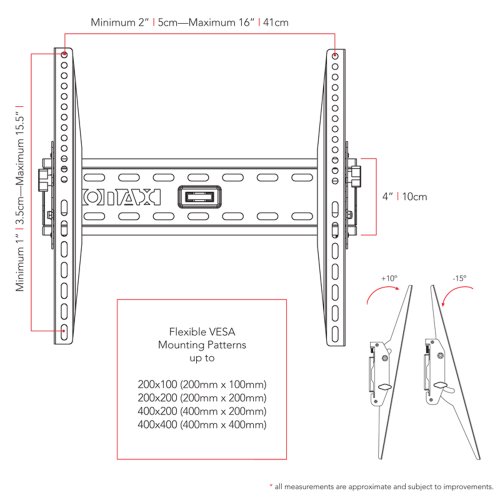 -. Binding : Kitchen -. Brand : Sonax -. Color : Black -. Department : Racks/Futons -. EAN : 0789474789672 -. Feature : Holds up to 36-kilogram/80-pound / Fits most 23-inch to 42-inch tv's / Low profile of only 7.4-centimeter from tv to the wall / Plus 10-Degree/minus 15-Degree up and down tilt with leveling system / Vesa mounting up to 400 by 400 -. IsAdultProduct : 0 -. IsAutographed : 0 -. Label : Sonax -. Manufacturer : Sonax -. Model : E-5055-MP -. MPN : E-5055-MP -. NumberOfItems : 1 -. PackageQuantity : 1 -. PartNumber : E-5055-MP -. ProductGroup : Furniture -. ProductTypeName : HOME_FURNITURE_AND_DECOR -. Publisher : Sonax -. Size : for most 23 - 42 inch TVs -. Studio : Sonax -. Title : Sonax E-5055-MP Tilting Flat Panel Wall Mount Stand for 32-Inch to 55-Inch TV -. UPC : 789474789672 -. Warranty : 1 year limited parts warranty