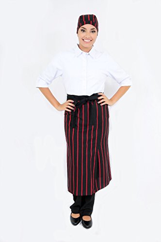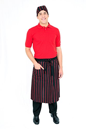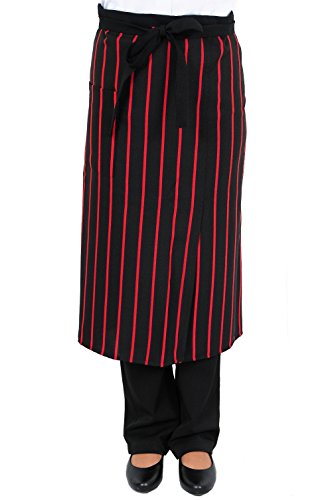 - PROFESSIONAL QUALITY BISTRO APRON: Black waist apron for men and women with red stripes. Features one pocket for storing small tools, pencils, pens, notepads, and other items. Machine washable.