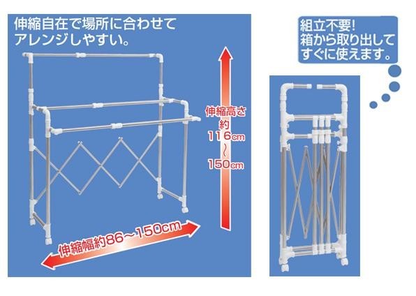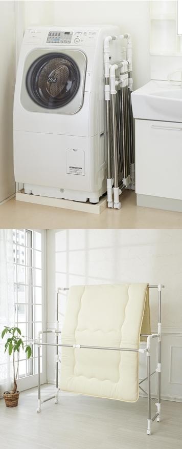 | 干す物の量や場所にピッタリ合わせられる伸縮式物干しです。ふとん・タオル・衣類など全部まとめて干せ、花粉・黄砂・PM2.5・梅雨対策に大活躍!!キャスターも取り付けられているので、箱から出してすぐに使用できます! |