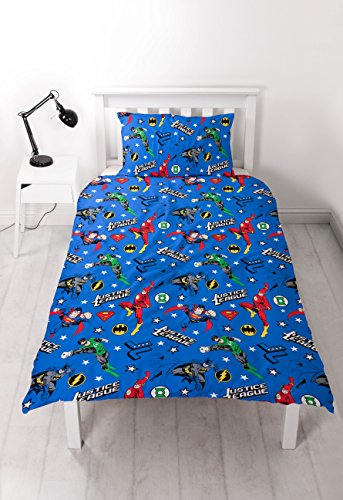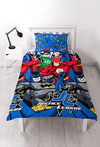 This awesome Justice League Inception single duvet cover set is a must for superhero and comic book fans! The design features fantastic images of Batman, Superman, Flash and Green Lantern in a collage style effect on one side, while the reverse has a smaller repeat pattern of the superheroes and their logos set on a blue background. This bedding set can be machine washed and tumble dried on a cool setting.