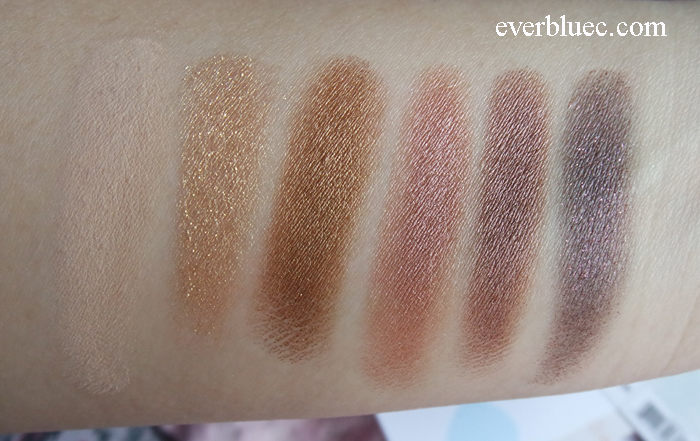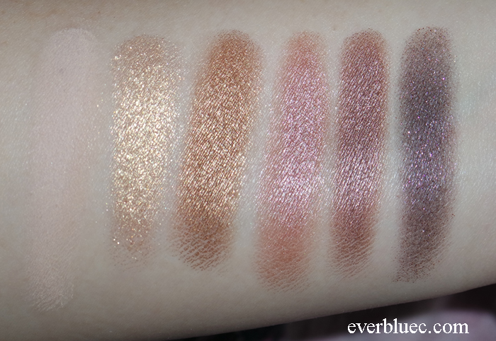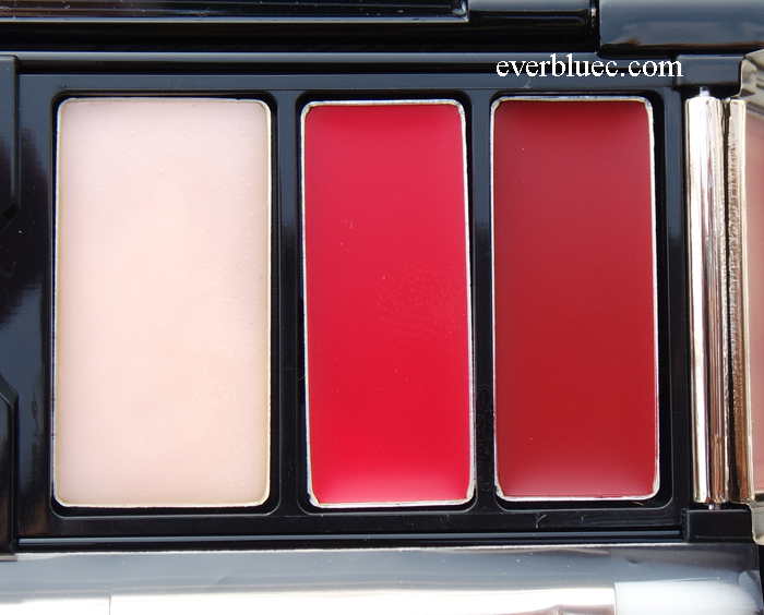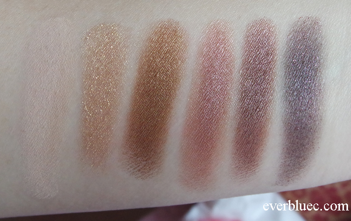 6 x 0.026 oz Eye shadow in Beige Matte, Gold Shimmer, Copper Shimmer, Gray Pink Shimmer, Mauve Pearl, Deep Purple Metallic 2 x 0.017 oz Matte lip colors in Cherry Red, Rich Burgundy 0.017 oz Lip base Dual-ended brush