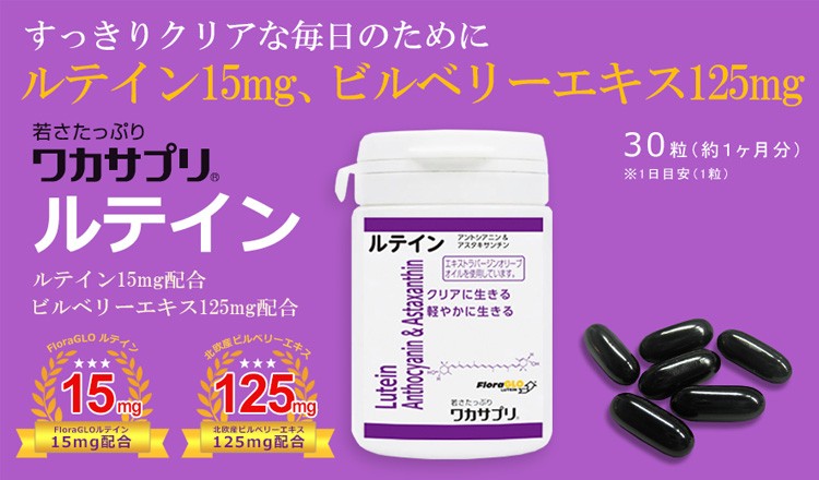 ≪ワカサプリルテイン人気の理由≫【FloraGLOルテイン】世界で最も信頼されているFloraGLOルテインのみを使用しています。農薬を一切使用せずに育てられたマリーゴールドのみを使用し、特許製法によって精製・結晶化されています。【mirtoselectビルベリーエキス】mirtoselectビルベリーエキスのみを使用されておりアスタキサンチンやゼアキサンチンなどのポリフェノールをブルーベリーのおよそ4倍も蓄えます。【ルテイン・ビルベリーエキス交配合】たった1粒にルテインを15mg、ビルベリーエキスを125mg配合しています。要な量をたった1粒の中に閉じ込めることができました。【エキストラバージンオリーブオイル】健康成分「オレイン酸」を豊富に含む、スペインで採れた上質なエキストラバージンオリーブオイルを配合しています。【植物性ハードカプセル(HPMC)】物性のハードカプセル「HPMCカプセル」を使用していますので胃の中で溶けやすく、ゼラチンアレルギーの心配がありません。