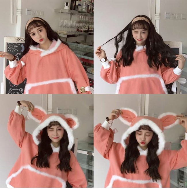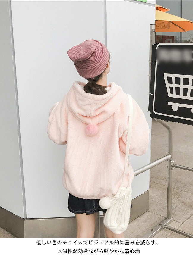 レディース用のパーカーが登場 ピンクよりのオレンジ色も、フードに付く耳も、フロントポケットとフードに飾るフワフワのフェイクファーの縁も 可愛らしさを極めるデザインでソフトな少女な甘みを思い存分演出 袖部分に大きめのリボンが付き、さらにキュートさをレベルアップ インナーとの組み合わせの悩みを省ける、これだけで十分目玉になる一枚 | |