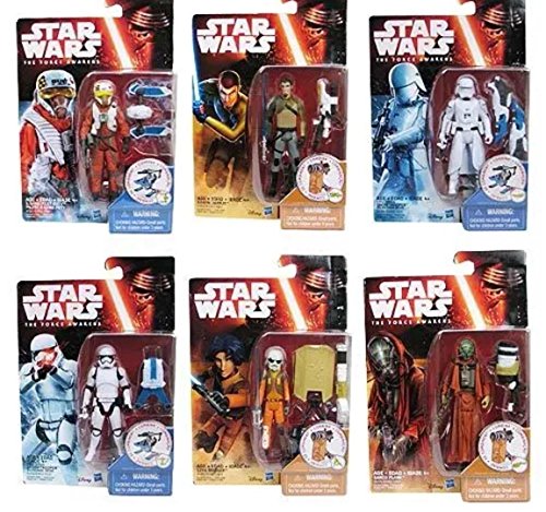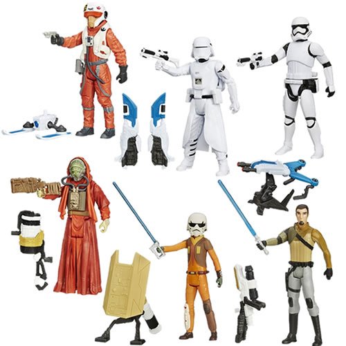 -. Binding : Toy -. Brand : Habsro -. EAN : 0026364458394 -. Feature : Set includes: First Order Snowtrooper, X-Wing Pilot, Kanan Jarrus, Ezra Bridger, Sarco Plank and First Order Stormtrooper / Each 3.75" figure in this assortment comes with a standard weapon accessory as well as a second custom weapon accessory (Build-A-Weapon feature). / Custom weapon accessories can be combined together with the custom weapons of the other three figures in their Mission Theme group to form a larger weapon! / Characters include heroes and villains from Star Wars Ep VII The Force Awakens, as well as characters from the classic films and The Star Wars Rebels Animated Series! / Ages 4+ -. Genre : Action -. IsAdultProduct : 0 -. Label : Hasbro -. Manufacturer : Hasbro -. PackageQuantity : 6 -. ProductGroup : Toy -. ProductTypeName : TOYS_AND_GAMES -. Publisher : Hasbro -. Studio : Hasbro -. Title : Star Wars Ep VII The Force Awakens 3.75" Missions Build-A-Weapon Snow and Desert Figure Set of 6 -. UPC : 026364458394