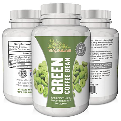 -. Binding : Health and Beauty -. Brand : MangaNaturals -. Color : White and Green -. Department : Health & Personal Care -. EAN : 0617209961560 -. Feature : Burns both sugar and fat, and slows the release of sugar into the bloodstream / 800 mg of Pure Green Coffee Bean Extract per capsule. Full 30-day supply. 60 vegetarian capsules per bottle. Made in the USA in our GMP certified manufacturing facility / Contains less than 1% caffeine (equivalent to 1/10 of a cup of coffee) / MADE IN THE USA in GMP certified Facility, with certified ingredients - Fully Guaranteed by MangaNaturals / formulated without any fillers, binders, or artificial ingredients -. Label : MangaNaturals -. LegalDisclaimer : Content on this site is for reference purposes and is not intended to substitute for advice given by a physician, pharmacist, or other licensed health-care professional. You should not use this information as self-diagnosis or for treating a health problem or disease. Contact your health-care provider immediately if you suspect that you have a medical problem. Information and statements regarding dietary supplements have not been evaluated by the Food and Drug Administration and are not intended to diagnose, treat, cure, or prevent any disease or health condition. Amazon.com assumes no liability for inaccuracies or misstatements about products. -. Manufacturer : MangaNaturals -. Model : MangaNaturals -. MPN : MangaNaturals -. PackageQuantity : 1 -. PartNumber : MangaNaturals -. ProductGroup : Health and Beauty -. ProductTypeName : HEALTH_PERSONAL_CARE -. Publisher : MangaNaturals -. Studio : MangaNaturals -. Title : Pure Green Coffee Bean Extract 800 with GCA Natural Weight Loss Supplement, Formulated Especially For Launching Your Green Coffee Bean Diet - Premium Quality -. UPC : 617209961560