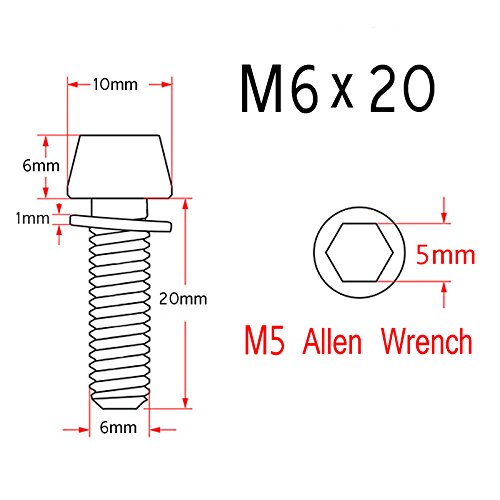 - Size: m6x20mm Allen Hex Tapered Head; Color Available: Colorful, Ti, Gold
