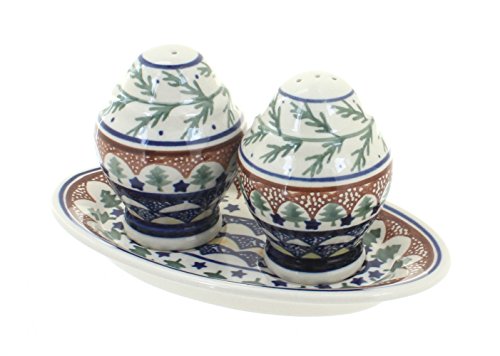 Polish Pottery Evergreen Salt & Pepper Shakers with Plate