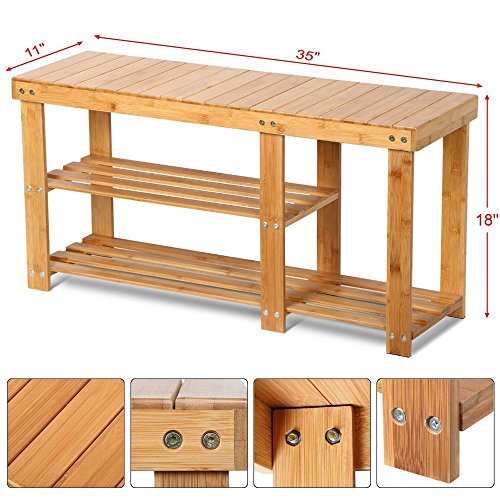 -. Feature : G.W.: 5.6 Kg/ 12.2 Lb / Material: Nan Bamboo (Spray Varnish) / Stylish Design-two tier shelves for normal shoes, one tier higher section for boots and heels / Exquisite Workmanship-natural color, smooth finish and round corners avoid scratching to protect your kids and family / Space Saver Shoe Bench-Dimension: 35'' L x 11'' W x 18'' H (90 x 28 x 45 cm)