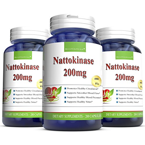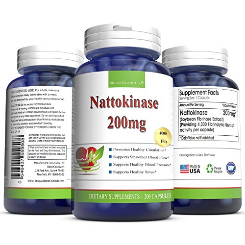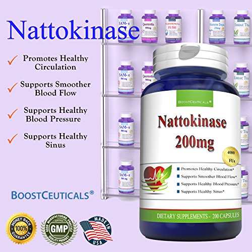- Feature : DOUBLE STRENGTH BEST NATTOKINASE supplement - A popular enzyme derived from Natto a Japanese soy food. Contains highest strength 4000 FU per capsule helping circulation for optimum heart health and maintenance of healthy blood pressure levels already within the normal range* / NATURAL HEART HEALTH VITAMINS - Blood can coagulate increasing risk of blood vessel damage and slow blood flow. Nattokinase supports healthy blood circulation by dissolving coagulation effects on blood by maintaining healthier levels of blood clotting factors ( blood thinner effect )* / BEST CARDIOVASCULAR HEALTH - Boostceuticals plus high dosage 200mg tablets are double the common Nattokinase 100mg and are 200 count not 90 or 100 Count. Compare the value of other products capsules for full value benefit.* / MADE IN USA IN FDA APPROVED LAB - Nattokinase makes a great blood pressure vitamin which lowers harmful build up in all blood vessels including arteries, veins and capillaries resulting in a smooth blood flow* / ORDER BEST NATTO SUPPLEMENT NO RISK - avoid future arterial pressure with Boostceuticals 200 mg Nattokinase 200 Vegetarian Tabs backed by a no fuss return guarantee*