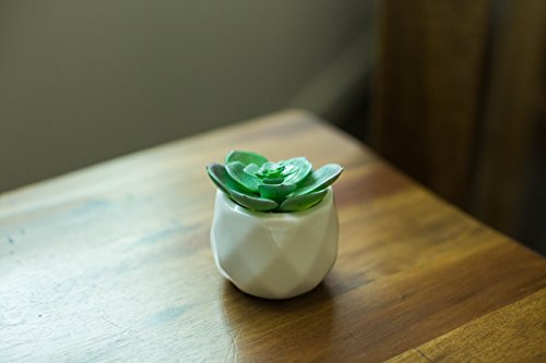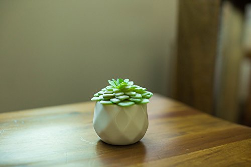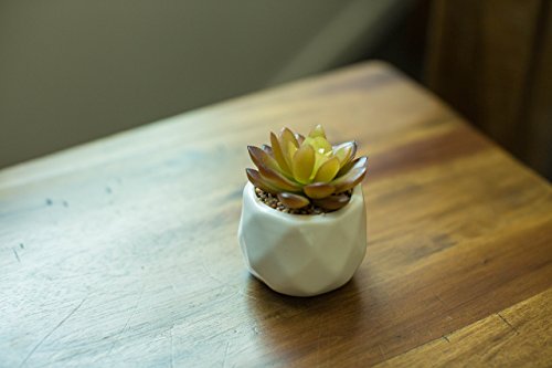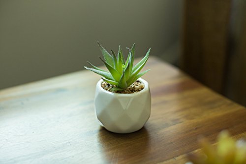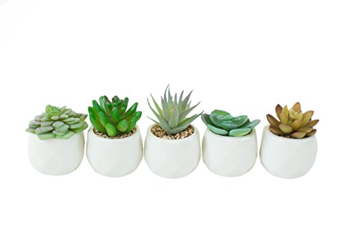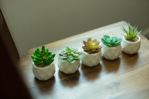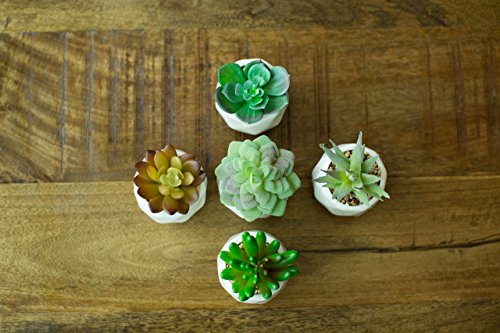 A SET OF 5 individual geometric modern white ceramic pots holding highly realistic succulents.