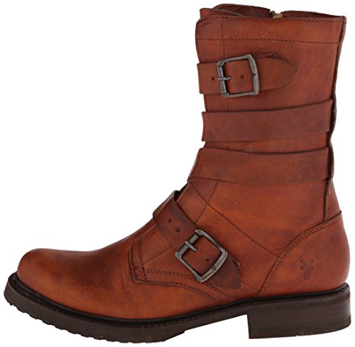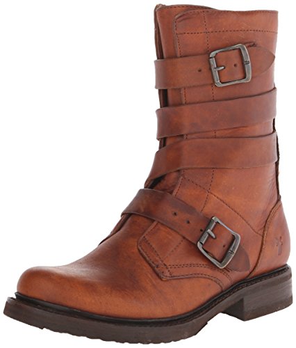 Mid-calf engineer boot featuring wrapping strap at shaft with two antiqued hardware buckles