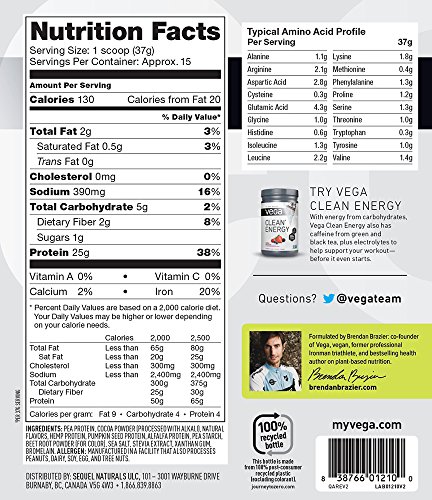 Your post-workout shake has been upgraded. Now with Vega Clean Protein you can build and repair muscles with 25 grams complete protein, 4 grams each BCAAs and glutamine-for only 130 calories. For once you don't have to compromise with your protein shake. Refuel cleanly, knowing that Vega Clean Protein is non-GMO, vegan, gluten-free, and made without artificial flavors, colors or sweeteners, or dairy or soy ingredients. Shaken or blended, Vega Clean Protein is best enjoyed 45 to 90 minutes after your workout in delicious Chocolate or Vanilla flavors.Feature