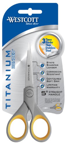 Westcott Titanium Bonded Scissors With Soft Grip Handles, Straight, Pointed Tip, 5-Inch, Grey/Yellow (13525)