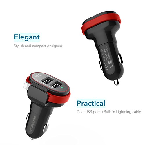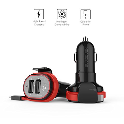 HengQiang Dual USB Car Charger with Build-in Lightning Cable 3.4A for iPhone 5/5s/5e/5c 6/6s/6plus 7/7plus iPads Mini/Air and Other Smart Devices (Black)