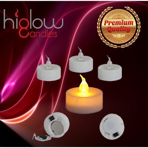 Studio : Higlow Publisher : Higlow Product Description Eglow Set of 12 LED Yellow LED Battery Operated Tea Lights have a flame shaped LED bulb which flickers (batteries already included inside). A Flickering Tealight Candles - Yellow without the danger of a real flame so no worry, no smoke, no wax and no fear of your candles blowing out! These are standard sized tea lights so they fit in any votive cups or tea light holders. These candles are perfect for Holiday decorations, Luminary Bags, Weddings, Parties, Special Events, Crafting,Restaurants or just for the Crisp Glow of Every Day Candle Use. They have a convenient on and off switch on the bottom and are priced just right. Don't be without the glow of candlelight for your next special event. 0