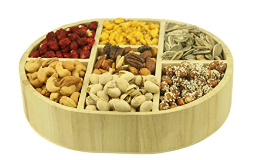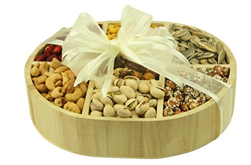 - Gourmet Assorted 7 Section Wooden Nut Tray - This Basket Includes: Roasted Salted Pistachios, Roasted Salted Cashews, Sugar Toasted Peanuts, Roasted Salted Sunflower seeds, Mixed Glazed Nuts, Corn Nuts