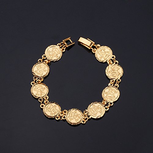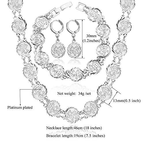 -. Feature : Name of Allah / Double safety clasp / Necklace length: 18 inches,Width:0.5 inch,earrings:1.2 inches / Bracelet length:7.5 inches,width: 13mm/0.5 inch / Material: environmental frendly copper,18k gold plated