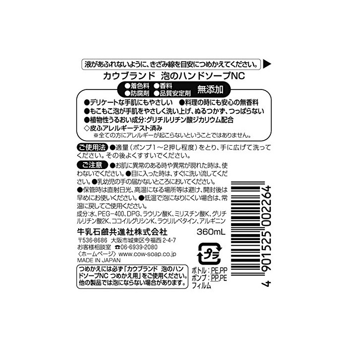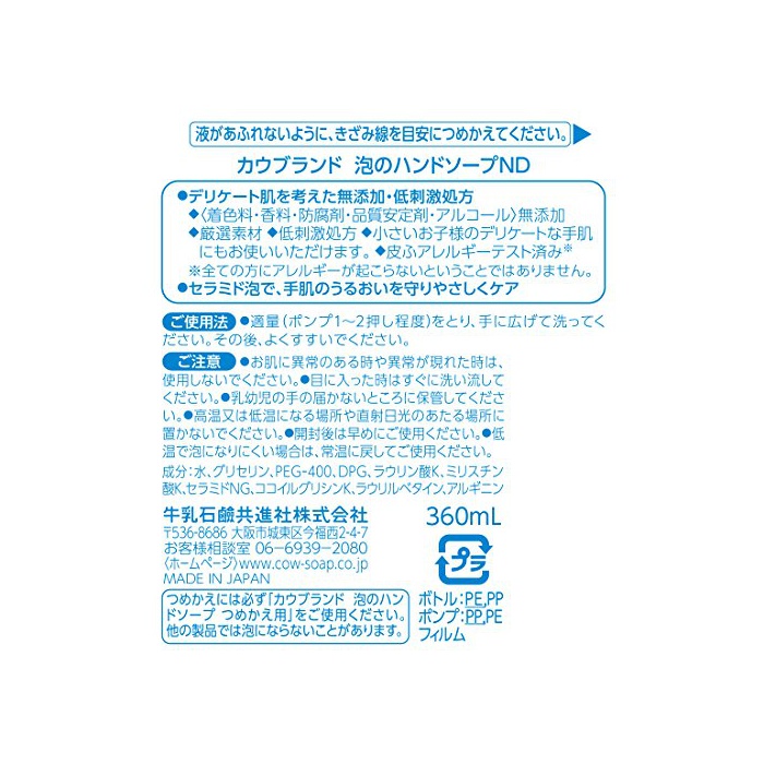 원본상품명: カウブランド 無添加泡のハンドソ?プ ポンプ付 360ml