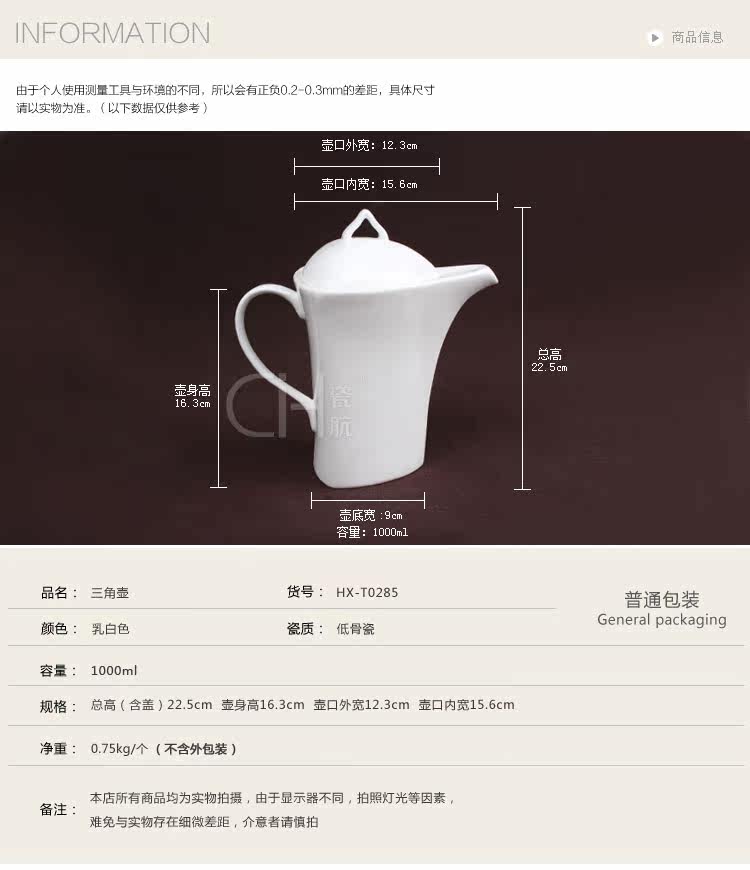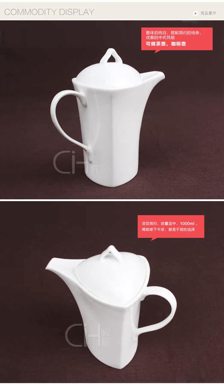 瓷航三角壶新款茶壶酒店创意陶瓷壶西式法式咖啡壶骨瓷茶具1000ml