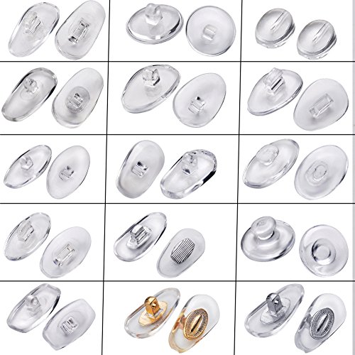 Material: Polyvinyl Chloride (PVC) The majority of polyvinyl chloride PVC nose pads are made of a soft firm plastic material that provides comfortable support of eyeglass frames over the facial nasal area. As with all nose pads fabricated from any material, nose pads need to be properly adjusted so that the nosepads fit flush against the skin, otherwise the weight of the eyeglass frame may leave pressure indentations on the skin. Main Features Premium Grade, Non-slip Silicone Nose pads Comfortable and practically weightless Allergy-free, barely noticeable when worn Very easy to put on and remove Available in many different sizes Washable, long lasting Package Include 150 Pairs of eyeglass nose pads (300 pieces) 1 x Storage case 0