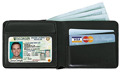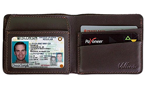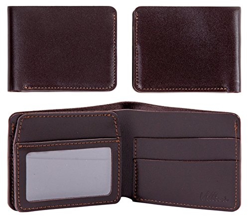 -. Feature : REAL LEATHER: Made out of top quality genuine leather in either a shade of vintage brown or traditional black , the luxuriously soft Villini bifold wallet is widely favored by collectors & those who appreciate fine leather goods / SLIM & STYLISH: We've designed this particular leather wallet for mens with an impressively slim profile & no lining has been added , giving way to a mini ID wallet case that comfortably slips in your pocket , purse or briefcase / CLEAR WINDOW: A transparent ID window flap has also been incorporated into the design , allowing you to quickly & easily display your license or badge when needed / 4 CARD SLOTS: There's even plenty of room for all of your credit cards , bank cards , membership cards & business cards ! The 4 interior card slots expand slightly to provide convenient storage for all of your must-haves / CASH POCKET: The practicality of our real leather wallet for men & women surely doesn't stop there . Featuring a folding long pocket , the bifold wallet can also contain your cash bills , travel documents , sticky notes , etc