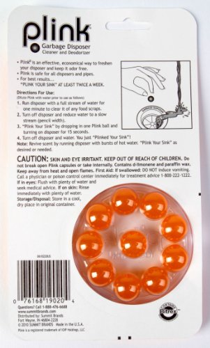 -. Feature : Plink balls clean and deodorize kitchen sink disposal / Set of 10 balls, in fresh citrus scent; use once or twice per week / Helps break up built-up fat and food particles in disposal / Biodegradable; won't harm plumbing; plastic case stores compactly / Recipient of Cooking Club of America seal of approval