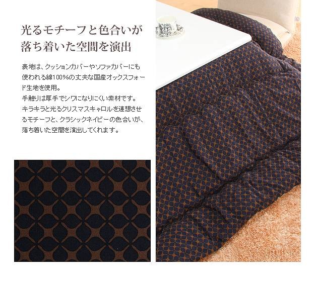 商品について:クッションやカバーにも使われる綿100%の丈夫な国産オックスフォード生地を使用した日本製のこたつ布団です。国内工場で綿入れ・縫製をしたこだわりの一品☆ボリュームたっぷり!すみまでしっかり綿が入ったふっかふかのこたつ布団です。