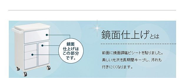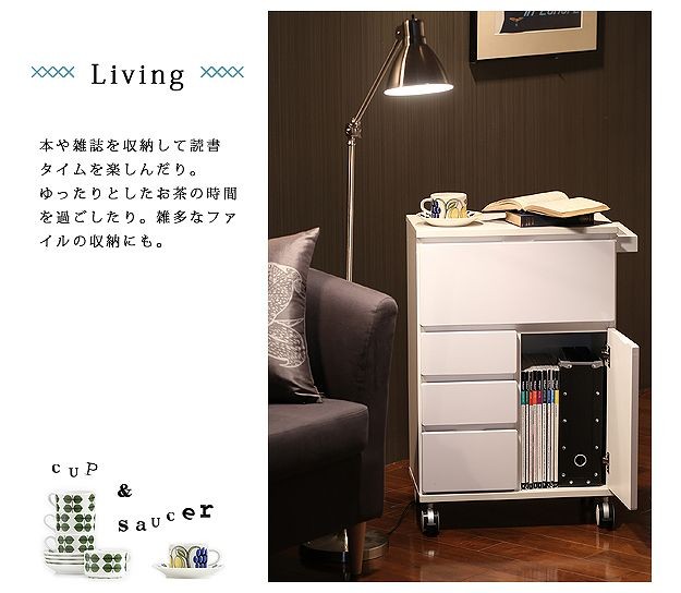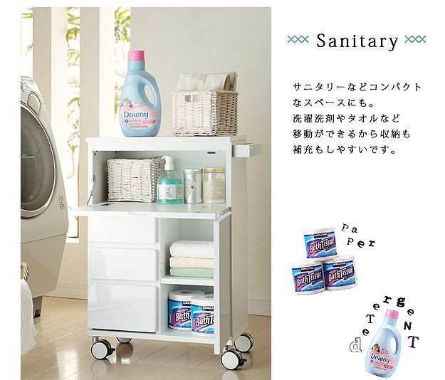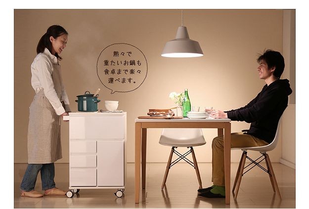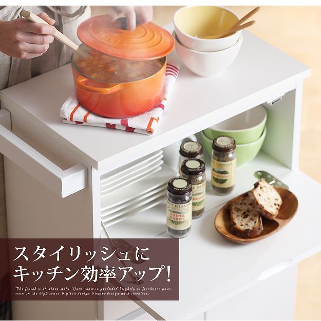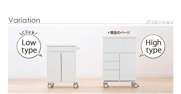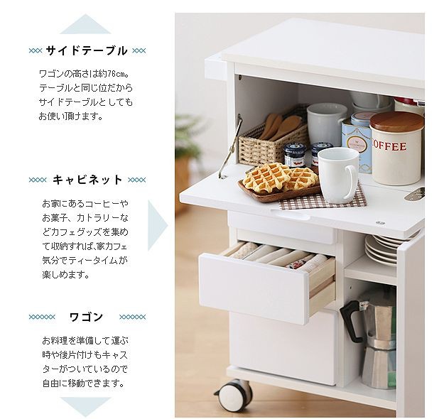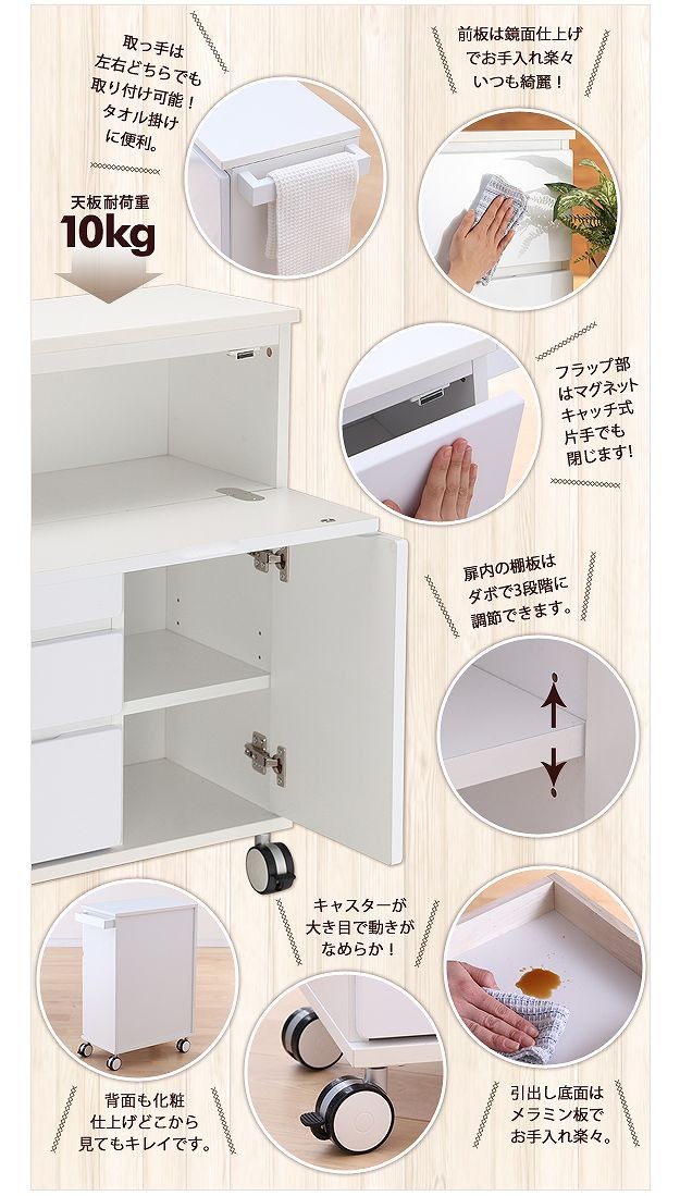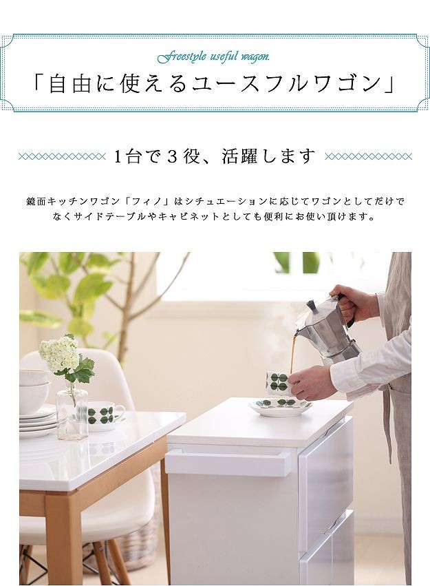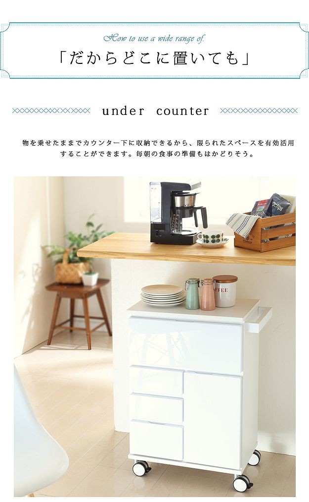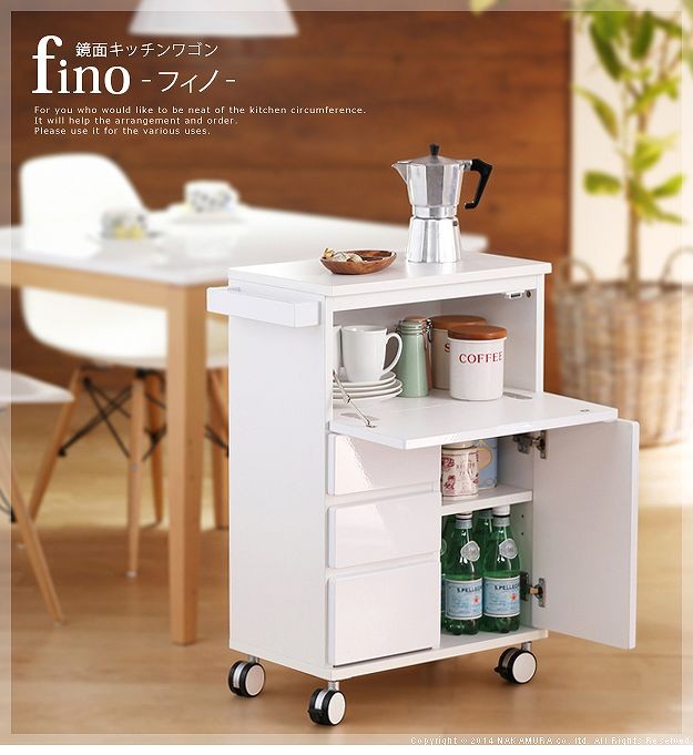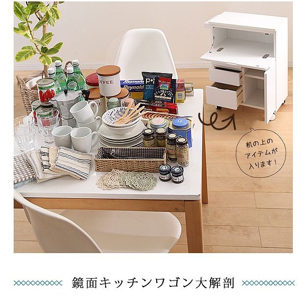 鏡面仕上げのキャスター付きキッチンワゴンハイタイプ。サイドテーブルとしても使いやすい高さの約75cm。カウンター下にも収まるコンパクト設計です。天板は熱に強いメラミン素材☆使い勝手だけではなく、キャスターや取っ手のデザインにもこだわりました。上部は物が取り出しやすいフラップ扉式、引き出しは小物収納に最適です。
